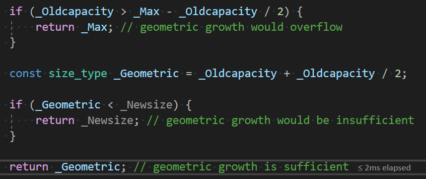 사실 필자는 벡터의 크기가 증가할 때 2배씩 커진다고 배웠었다. 이에 의문이 생겨 찾아본 결과 반드시 2배도 아니고 반드시 1.5배도 아니다. 이는 컴파일러의 버전마다 다르게 보이는데 예를 들어 GCC 6.3.0에서 실험을 했을 때는 capacity가 2배씩 늘어났고 Visual Studio의 C++ 17 버전 컴파일러 환경에서는 1.5배씩 증가했다. 이를 좀 더 정확히 알아보기 위해서 직접 <vector> library에 push_back이 되는 곳을 찾아가 보았다.