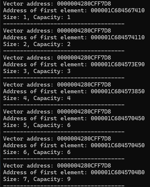 다음으로, Address of first elements는 capacity가 변경될 때마다 바뀐다.